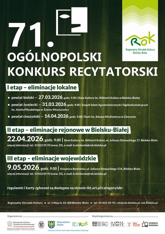 Końcem marca br. rozpocznie się pierwszy etap – eliminacje lokalne – 71. Ogólnopolskiego Konkursu Recytatorskiego, najstarszego i największego konkursu recytatorskiego adresowanego do amatorów – młodzieży ze szkół ponadpodstawowych i osób dorosłych.