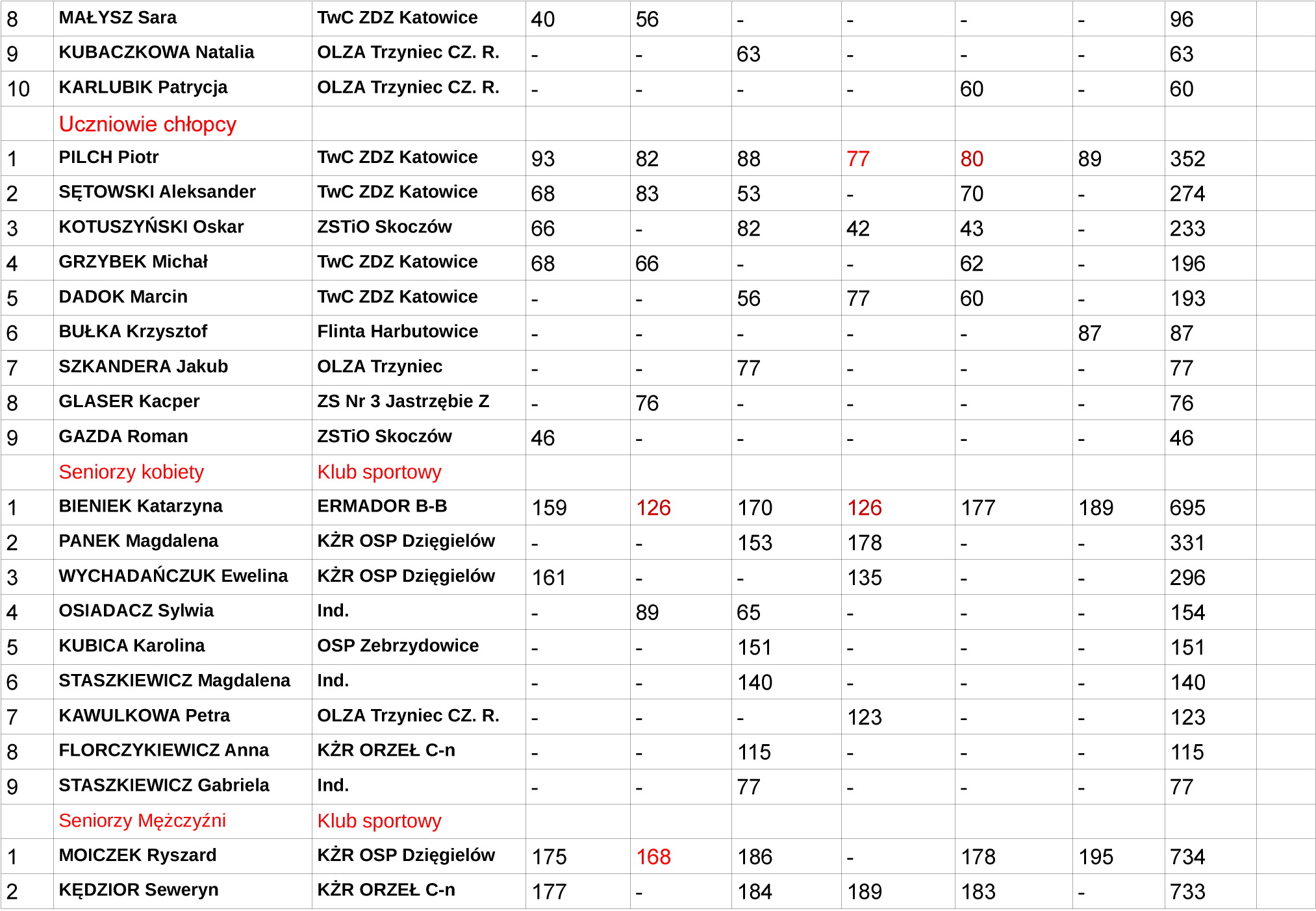 Tytuły mistrzowskie w poszczególnych kategoriach wiekowych wywalczyli: Katarzyna Bieniek (KS Ermador Bielsko-Biała), Wiktoria Witas (TwC ZDZ Katowice), Ryszard Moiczek (KŻR LOK OSP Dzięgielów) oraz Piotr Pilch (TwC ZDZ Katowice).