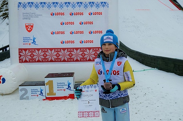 Kacper Jarząbek po raz kolejny w tym sezonie stanął na najwyższym stopniu podium w zawodach LOTOS Cup 2017 w skokach narciarskich i umocnił się na prowadzeniu w klasyfikacji generalnej cyklu w kategorii Junior E. W sobotę zawodnik TS Wisły Zakopane w pierwszym skoku lądował na 42 metrze, natomiast w drugim uzyskał półtora metra dalej i tym samym wygrał zawody, pokonując o 4,2 punktu Daniela Škarkę z Czech (41,5 i 43 m). Po raz pierwszy w karierze na podium zawodów LOTOS Cup stanął Tymoteusz Cienciała z klubu WSS Wisła, który w sobotę wywalczył brązowy medal, skacząc 40,5 oraz 41,5 metra. - Mogę powiedzieć, że były dzisiaj bardzo dobre warunki. Trener pochwalił mnie za dojazd i jak zrobiłem go w końcu dobrze, od razu odleciałem - mówi popularny „Tymek”. - W pierwszej serii mogłem jeszcze skoczyć tak daleko jak w finale, wtedy wynik byłby lepszy i jeszcze mogłem dalej skoczyć do kombinacji, ale bardzo się cieszę z dzisiejszego dnia - dodaje z uśmiechem na twarzy. - Spodziewałem się, że w końcu mogę stanąć na podium, ponieważ złapałem akurat formę na „Lotosy” - podkreśla młody wiślanin.
